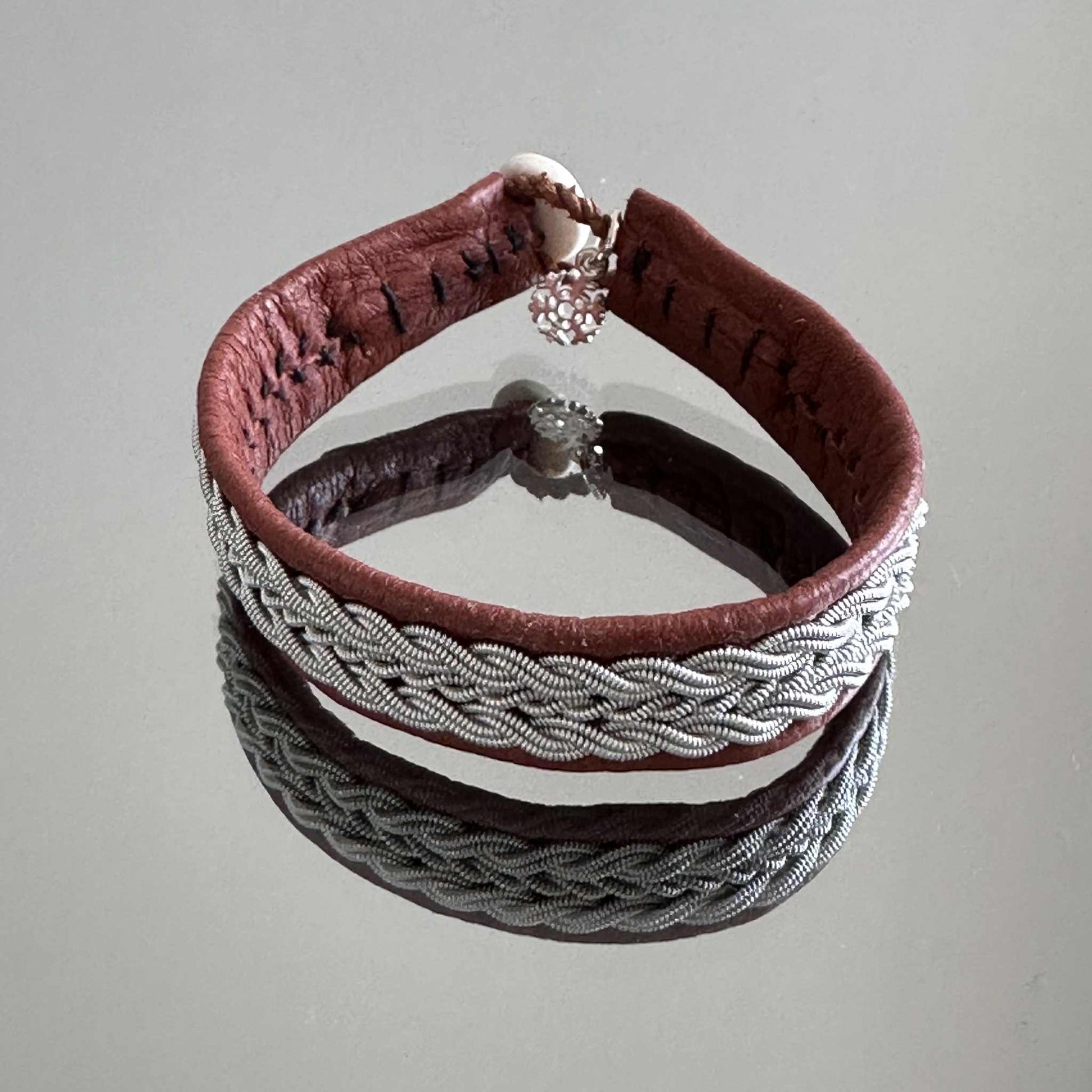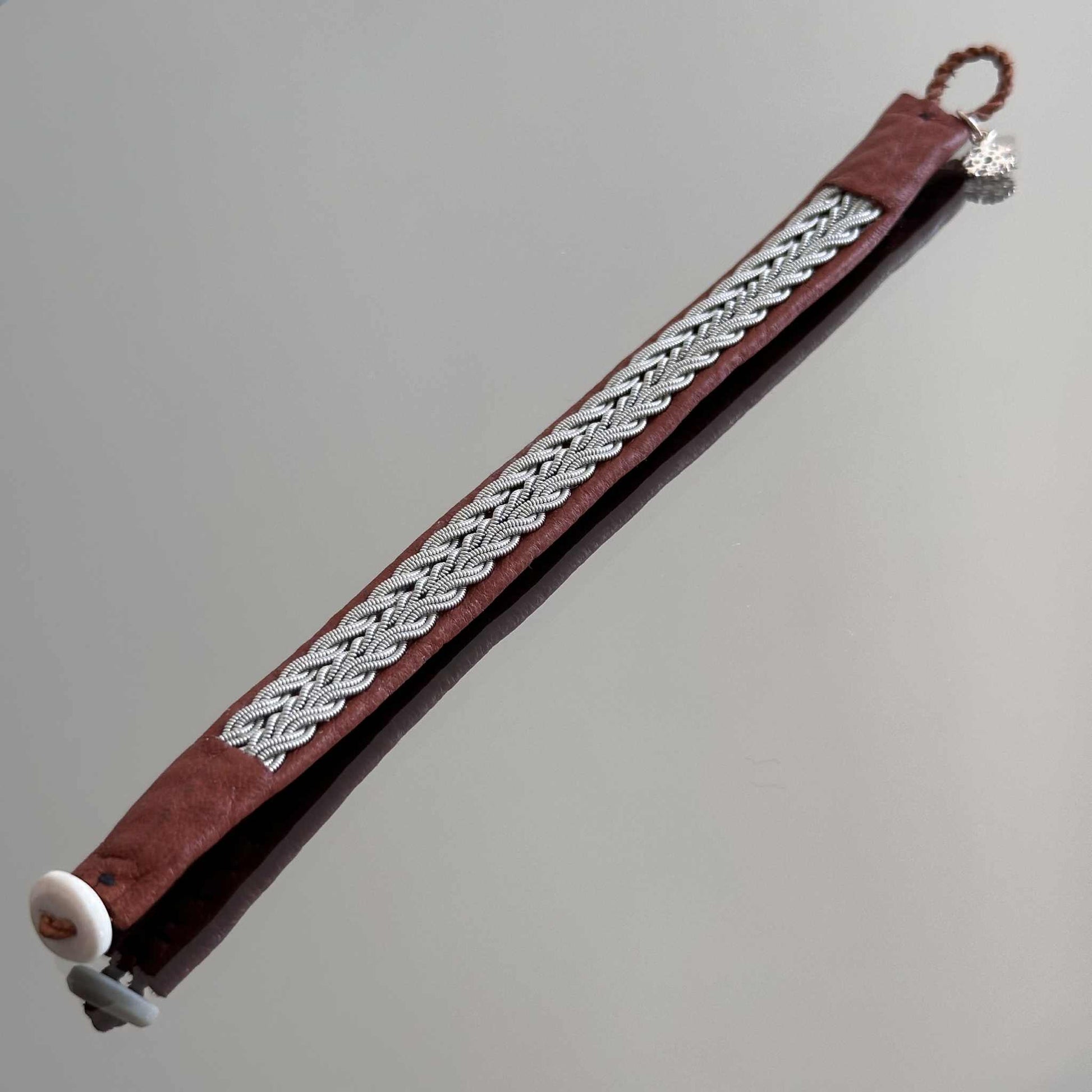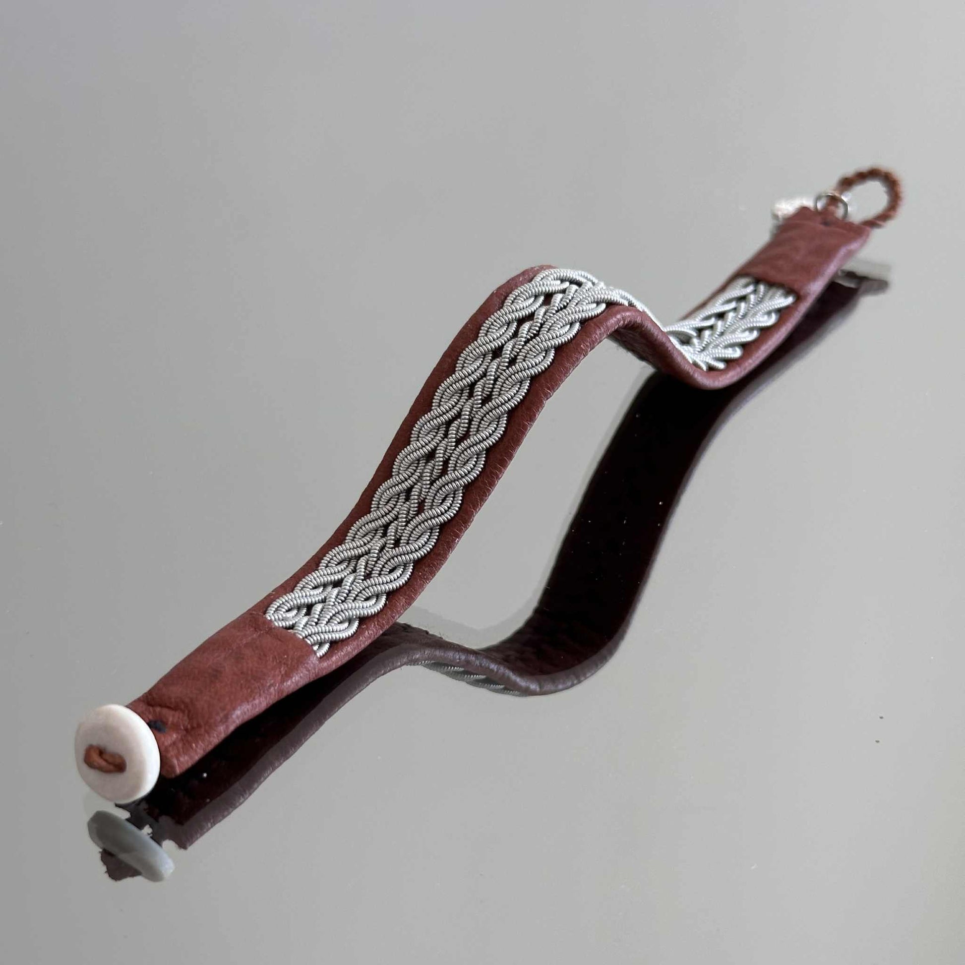 Handcrafted from soft reindeer leather and braided pewter wire. Finished with a natural reindeer antler button. Nickel-free and eco-friendly.