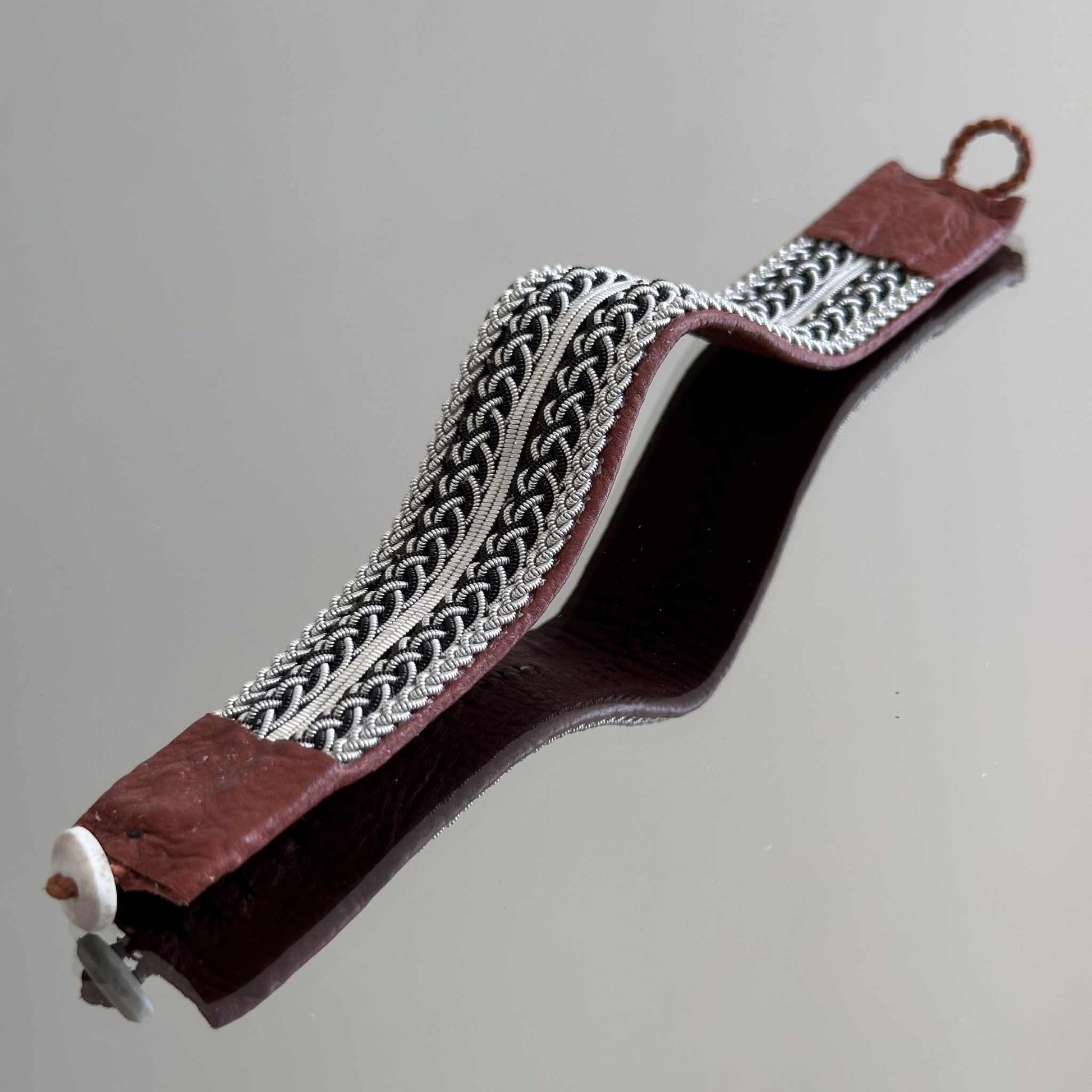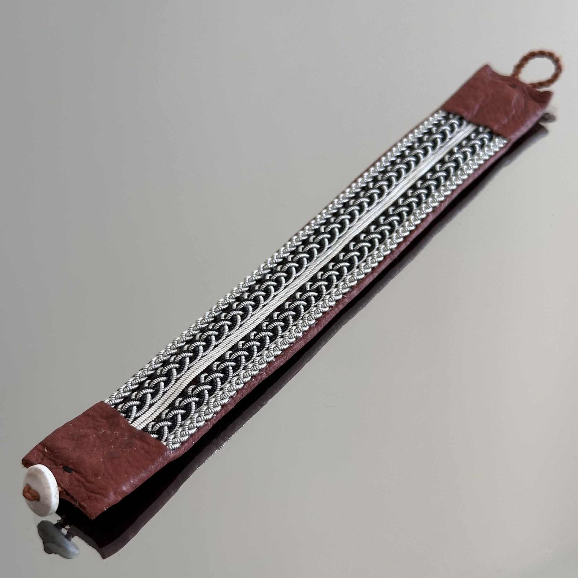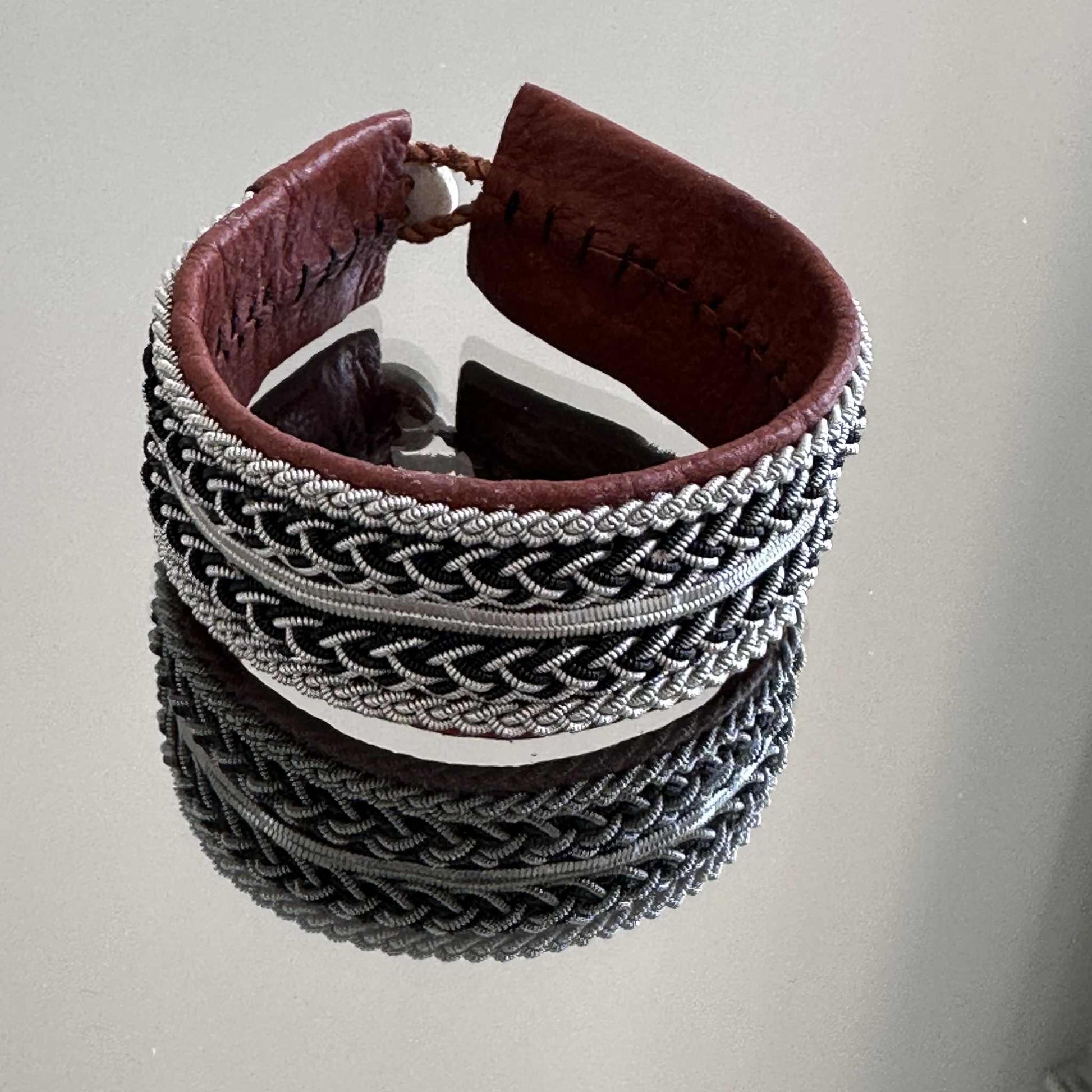 Handcrafted from soft reindeer leather and braided pewter wire. Finished with a natural reindeer antler button. Nickel-free and eco-friendly.